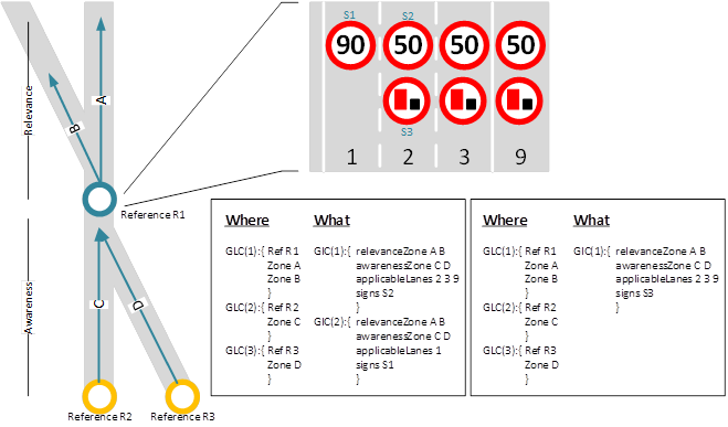 Figure: Graphical example of starting points and required information: (In this case the speed limitations and overtake prohibitions are from different sources, resulting in two different IVI messages.)