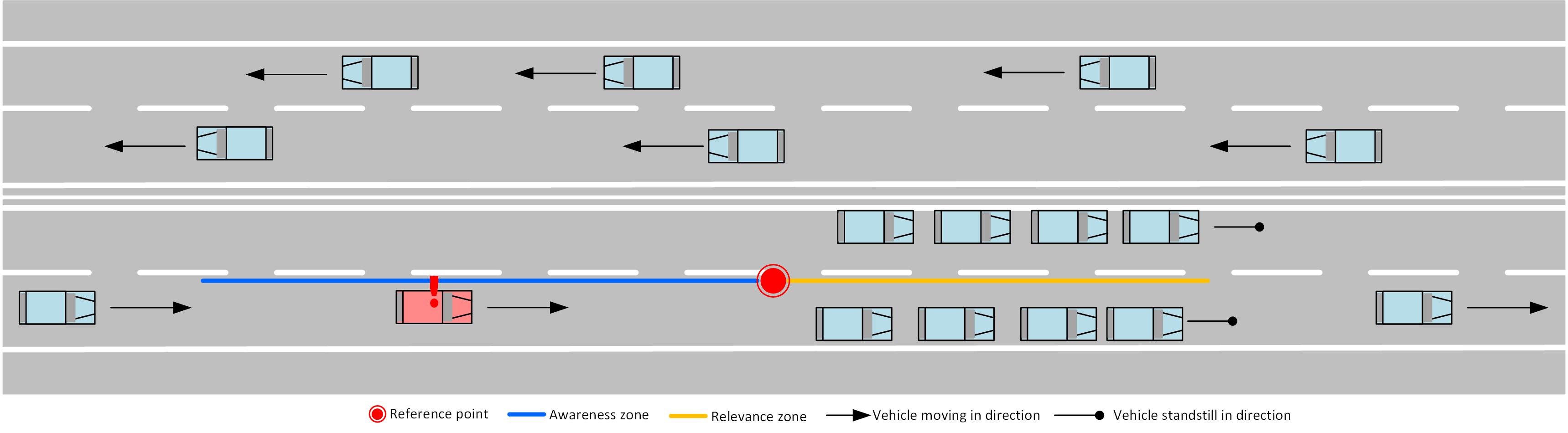 The vehicle, upstream of the traffic jam (red vehicle in figure), receives a notification of traffic jams on its route and is informed about the location and distance to the traffic jam.