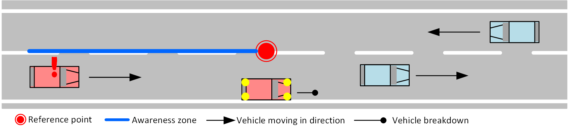 The alert for road users entering a zone with encounter of accident or broken down vehicle.