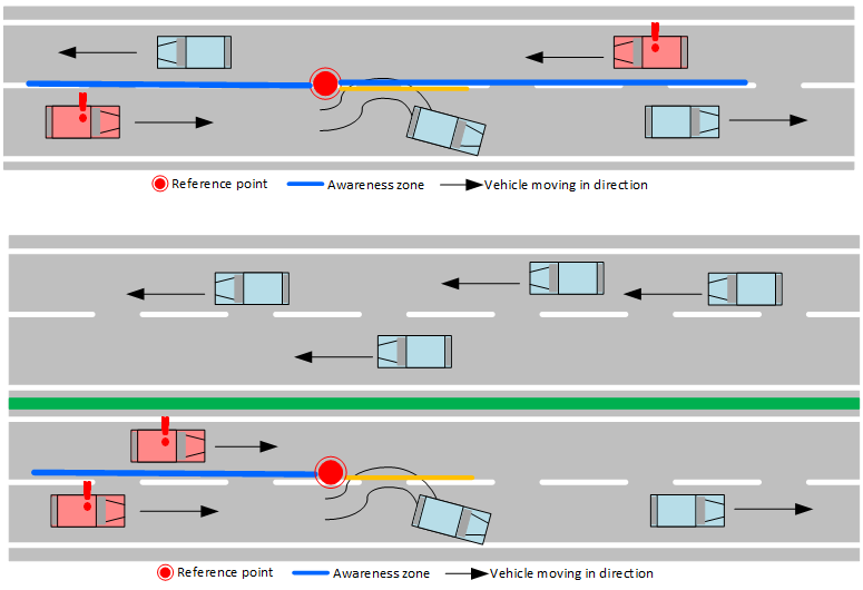 Opposite direction for event: If there is no hard deviation between the opposite lanes, the event is always duplicated (in PIP) for the opposite direction. This guarantes that all possible involved road users will get the warning message. On roads with separate tracks, there is no duplication. Except for weather oriented messages. If there is a road separation is based on the road geometry in OSM.
